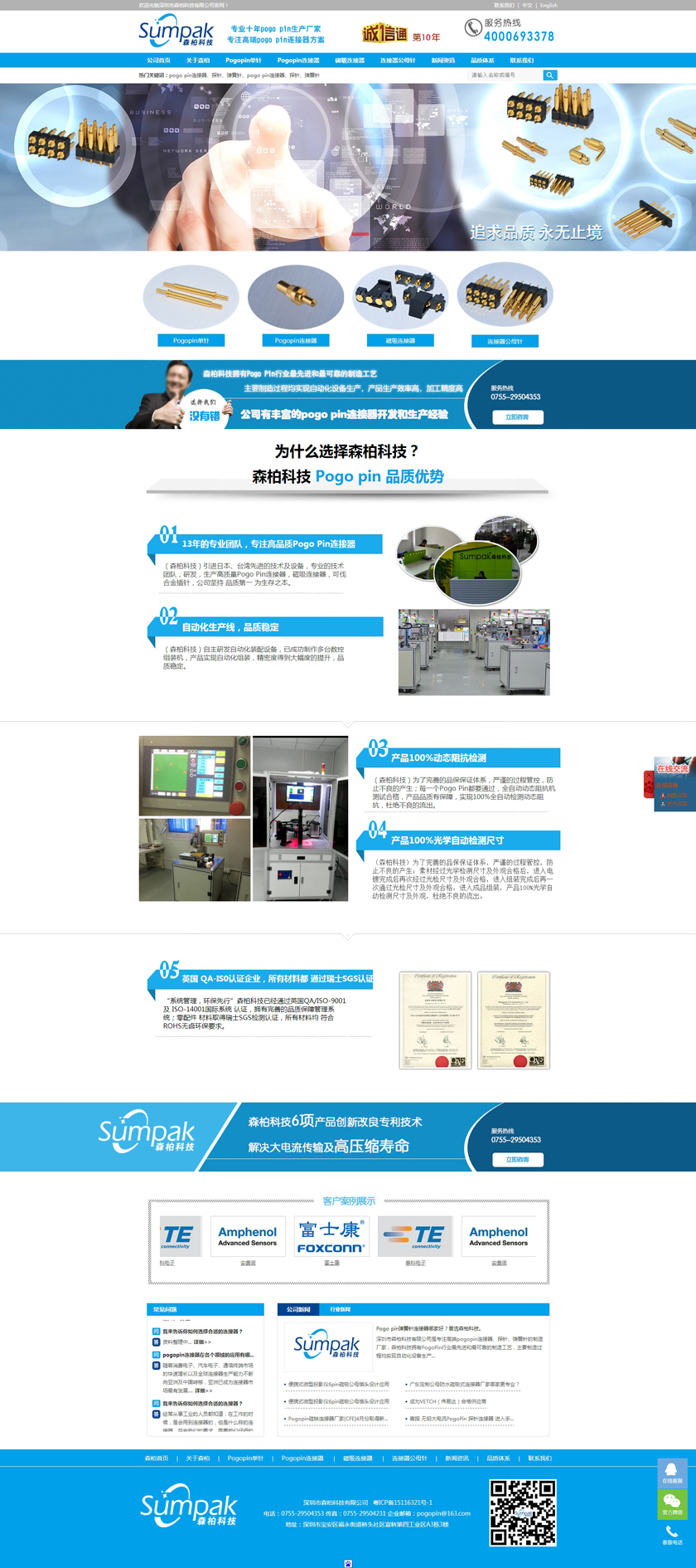Project Description 深圳市森柏科技有限公司是专注高端pogo pin连接器、探针、弹簧针的制造厂家,森柏科技拥有Pogo Pin行业最先进和最可靠的制造工艺,主要制造过程均实现自动化设备生产,产品生产效率高,加工精度高,重要检测过程均采用自动化快速识别系统,大大降低了人为操作失误的风险,极大的提升了检测效率,工艺过程得到极大的改善和满足。因此产品质量和稳定性获得巨大突破。 Official website address 内江http://www.zgsumpak.com I want to share
